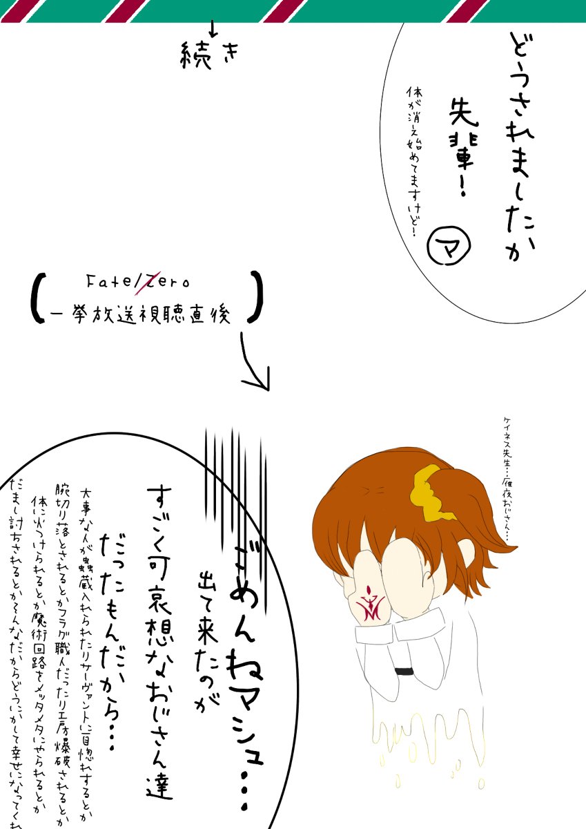 Fateまともに戦わせてもらえないケイネス先生かわいそうだ /6/6 Fate , まとめ 39 55 この世全ての名無し (日)目が覚めたケイネスは緊縛プレイ中。 そばにいるのは婚約者「ソラウ」。 なんか肩幅狭くなった気が。 魔術回路がめっためたにされてることを知り、四肢も動かせず、ただただ涙を流すケイネス。 これはかわいそうすぎる。アニメ Fate/Zeroイラストコンテスト Fate/Zero ケイネス ケイネス・エルメロイ・アーチボルト なにこれかわいそう デフォルメ ランサー(Fate/Zero) 11年11月16日 0015